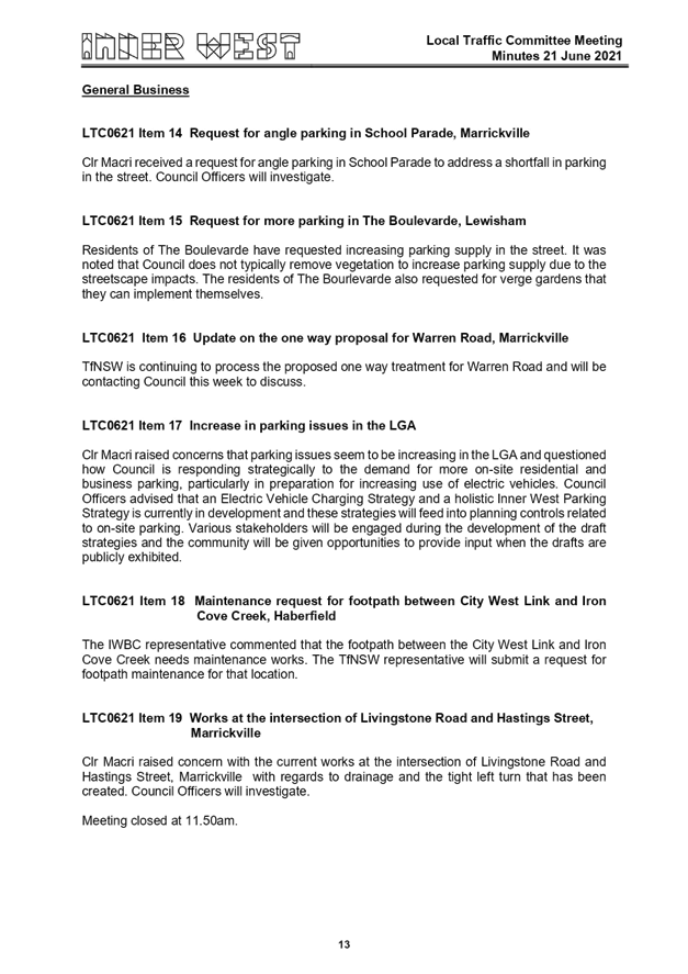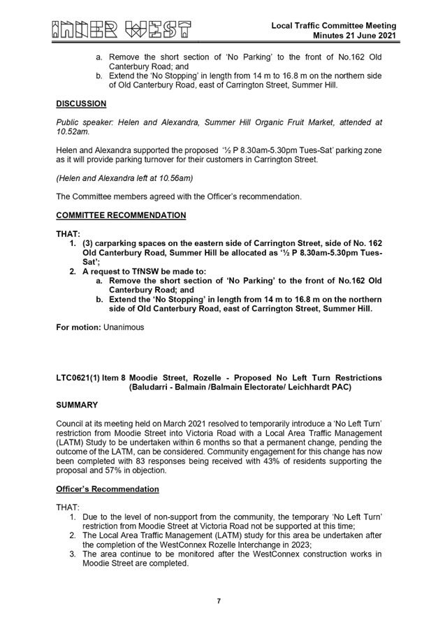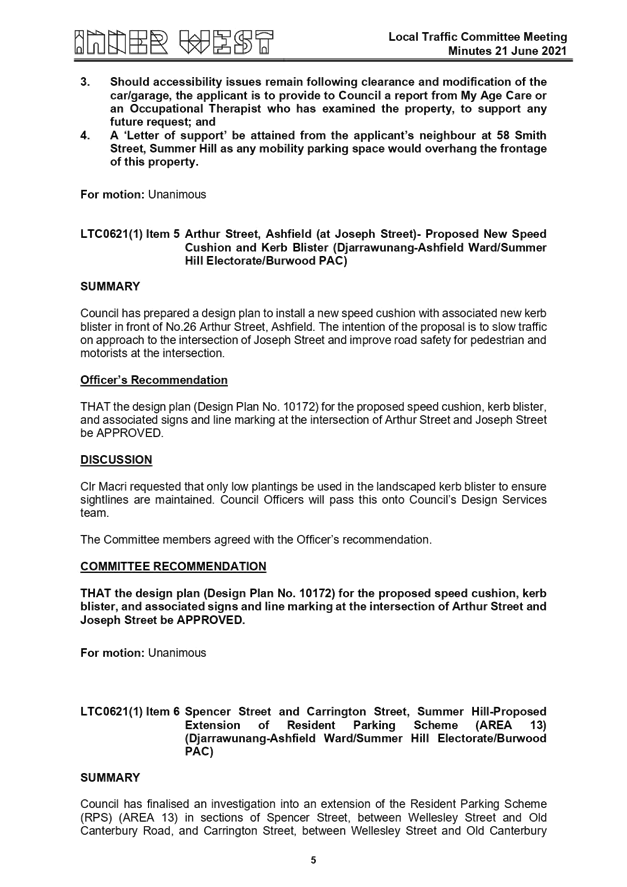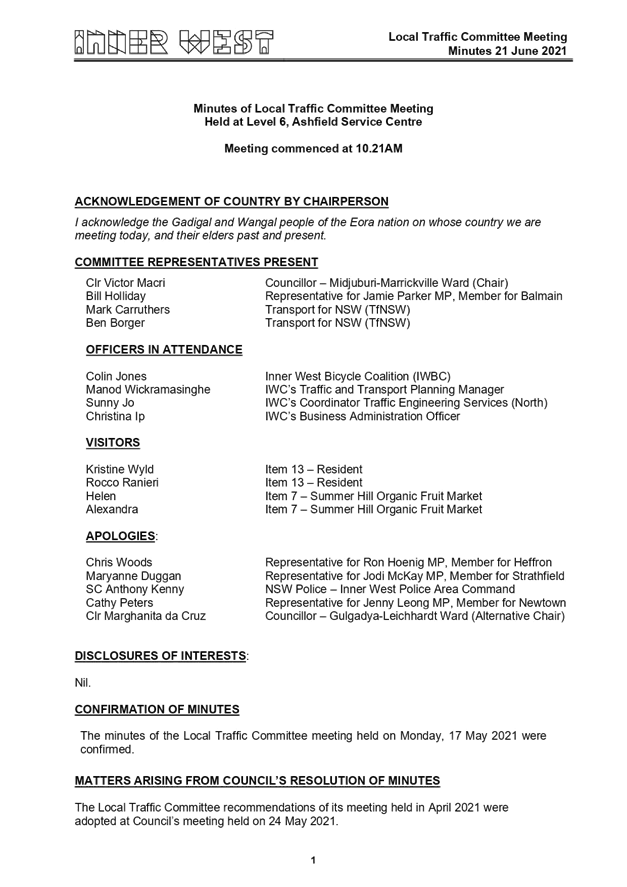 The June 2021 meeting of the Local Traffic Committee was held at the Ashfield Service Centre. The minutes of the meeting are shown at ATTACHMENT 1.