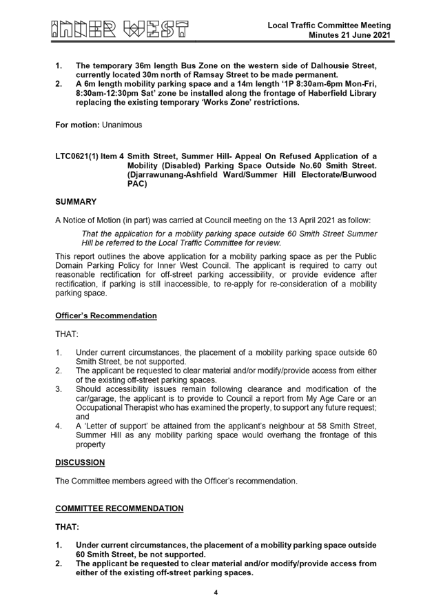 Smith Street, Summer Hill- Appeal on Refused Application of a Mobility (Disabled) Parking Space Outside No.60 Smith Street |