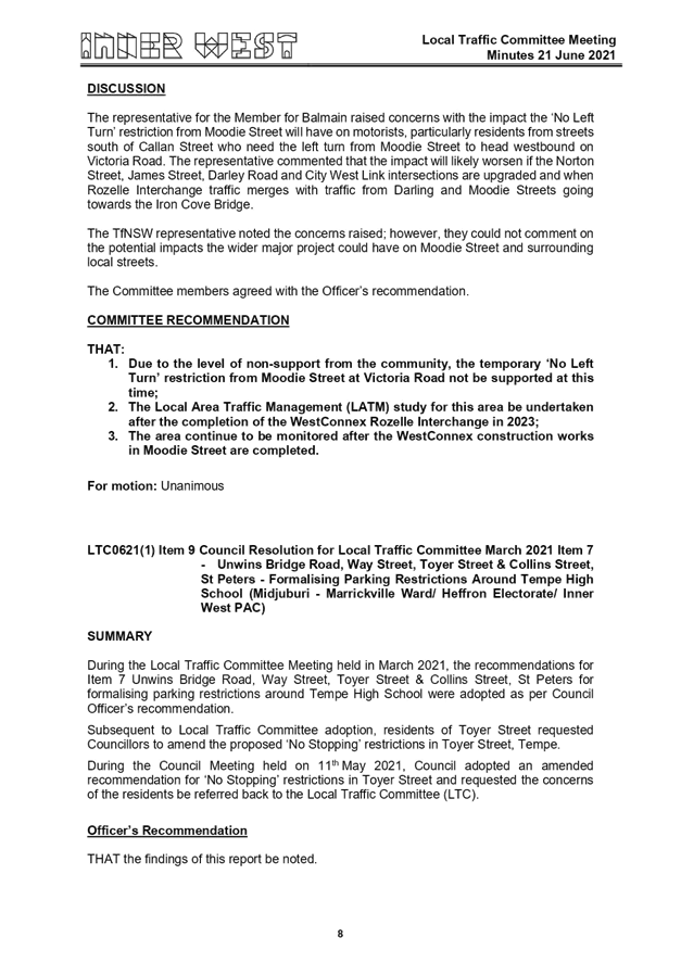 Council Resolution for Local Traffic Committee March 2021 Item 7 - Unwins Bridge Road, Way Street, Toyer Street & Collins Street, St Peters - Formalising Parking Restrictions Around Tempe High School |