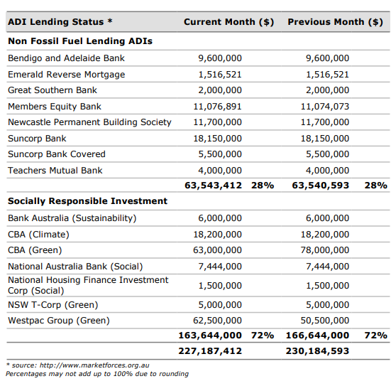 Council’s holding in various investment categories are listed in the table below. Council’s portfolio size is $227.2m. All Socially Responsible Investments (SRI’s) are investments that comply with the Non-Fossil Fuel standards. Council’s annualised return continues to exceed the bank bill index benchmark. Council’s portfolio had a return of 0.91%, above the UBSWA Bank Bill Index Benchmark (0.06%).