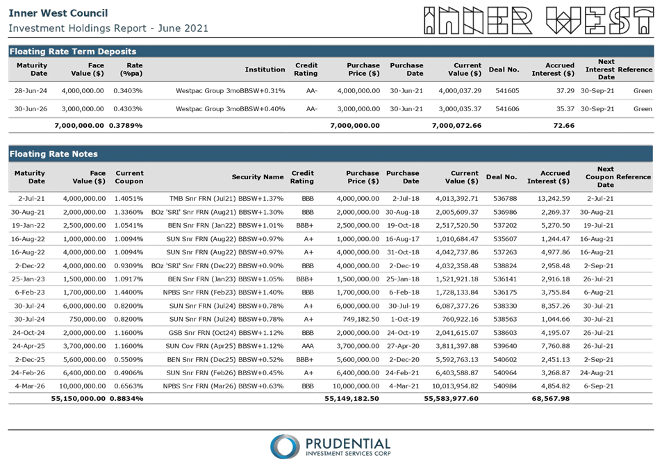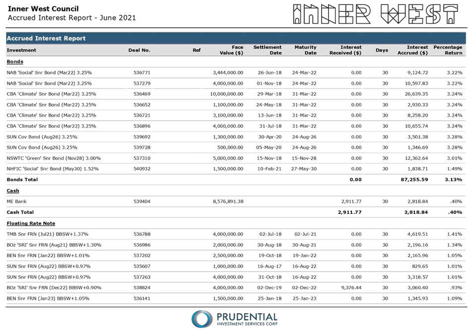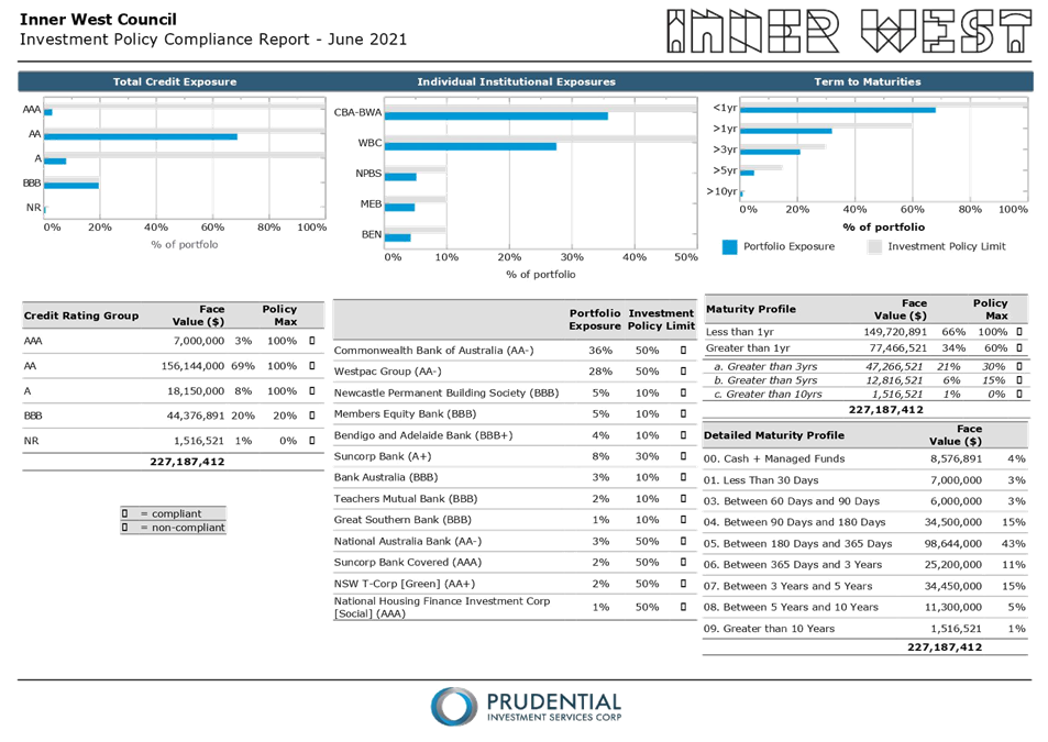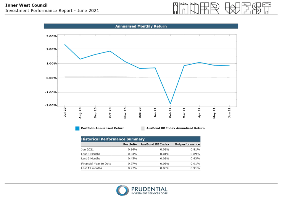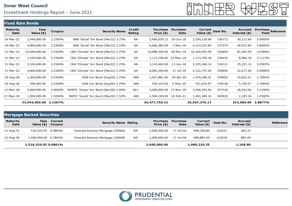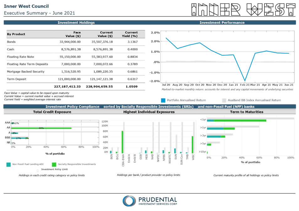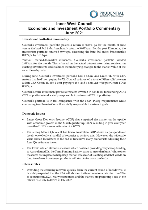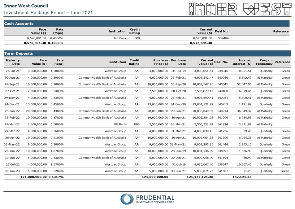 All investments made for the month of June 2021 have been made in accordance with the Local Government Act, Local Government Regulations and the Inner West Council Investment Policy.