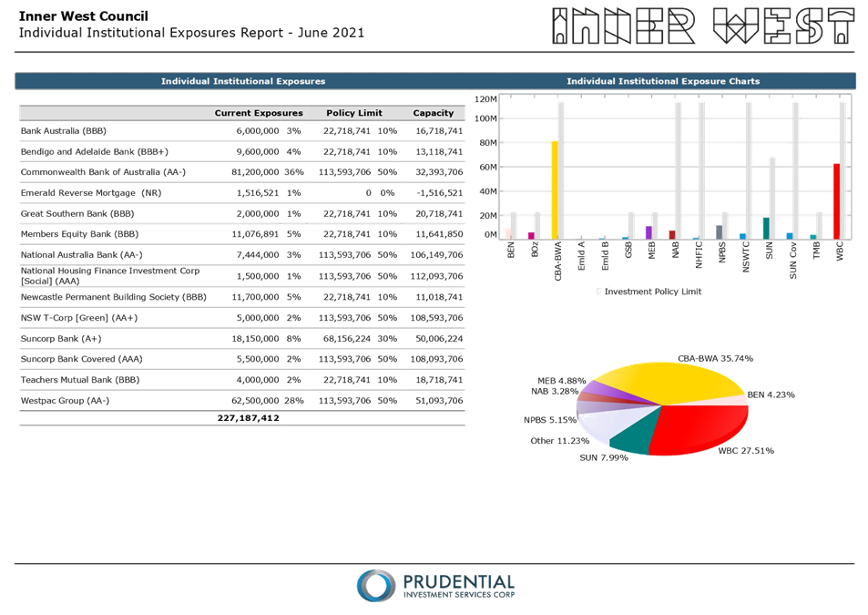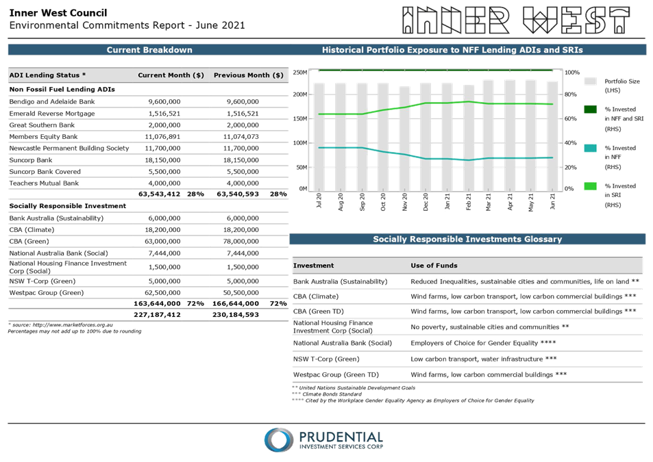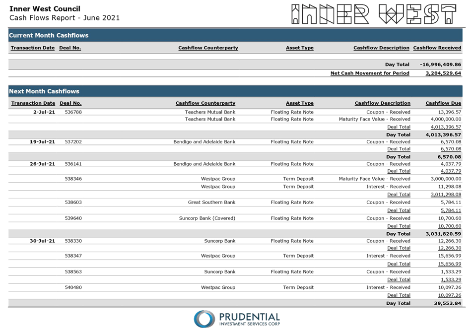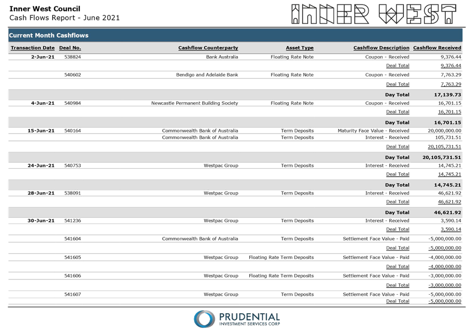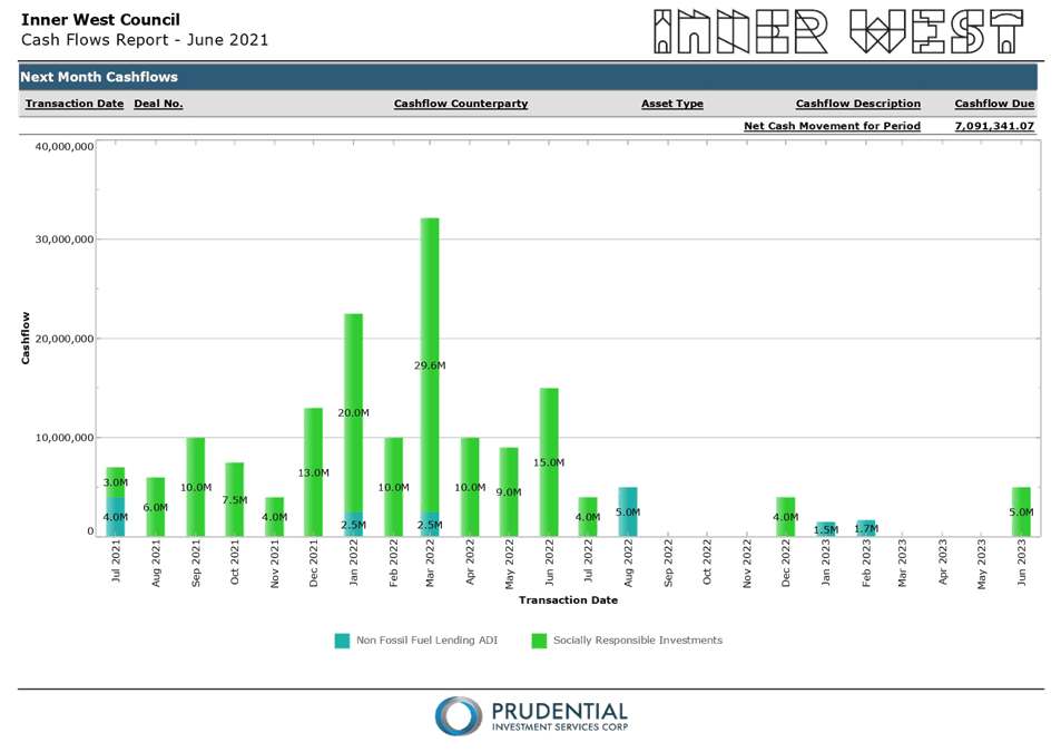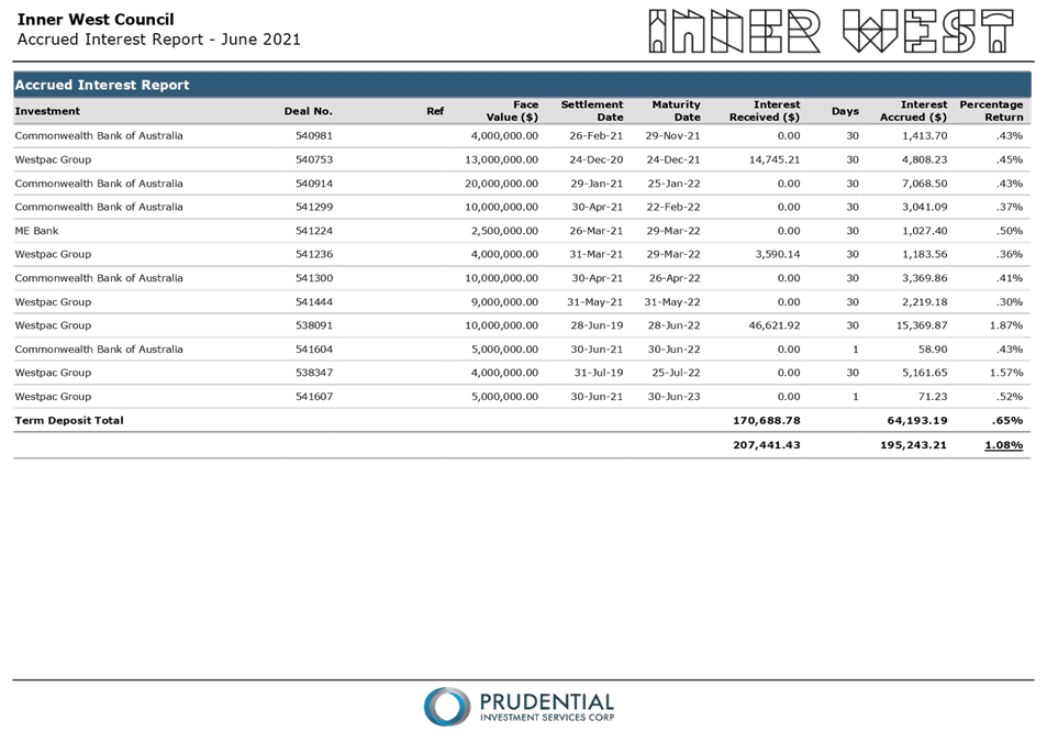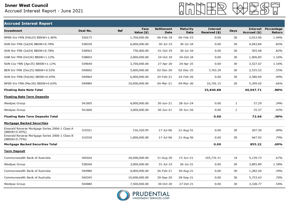 All investments made for the month of June 2021 have been made in accordance with the Local Government Act, Local Government Regulations and the Inner West Council Investment Policy.