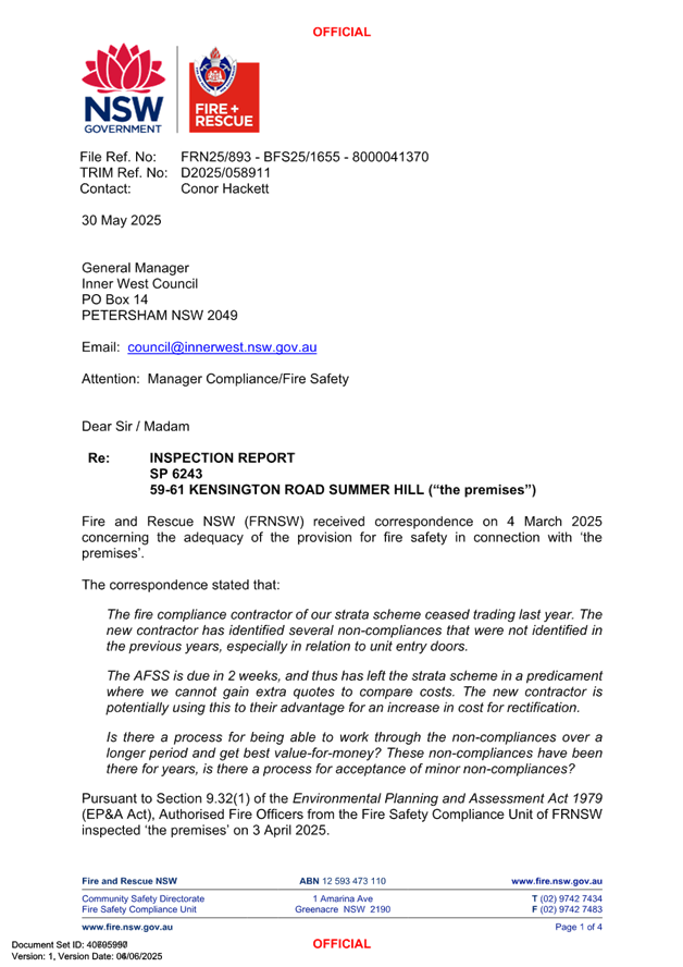 C0925(1) Item 23 Mandatory Reporting to Council of report received from Fire & Rescue NSW - 59-61 Kensington Road Summer Hill and 2A Brown Street Ashfield 527