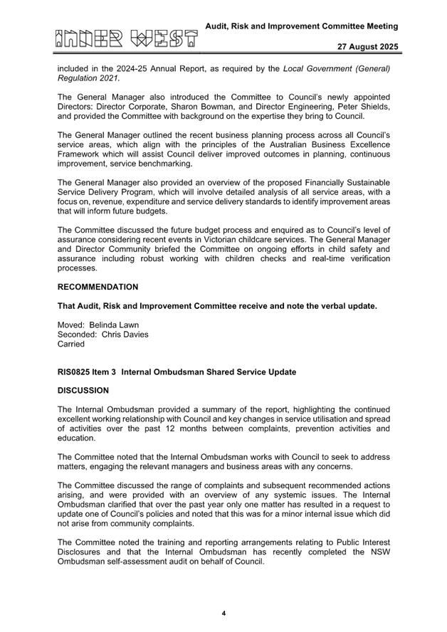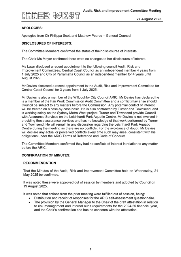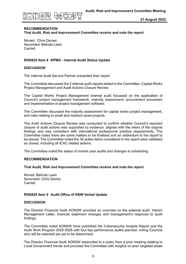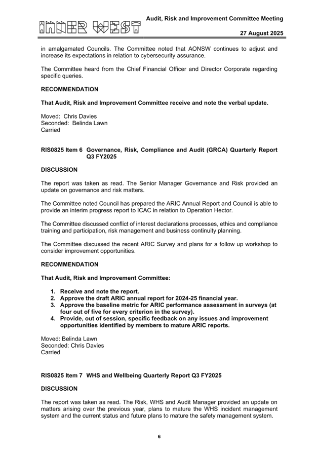 The draft confirmed minutes of the Audit, Risk and Improvement Committee (ARIC) meeting held on 27 August 2025 are attached for Council’s consideration, including the draft ARIC Annual Report 2024-25.