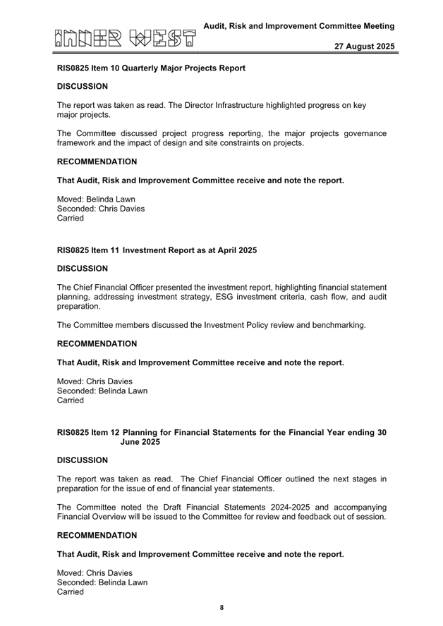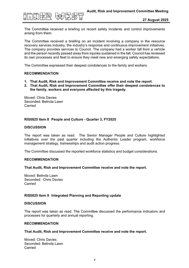 1. That Council receive the minutes and adopt the recommendations of the Audit, Risk and Improvement Committee meeting held on 27 August 2025.