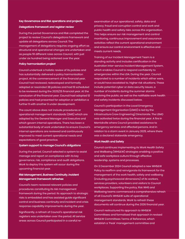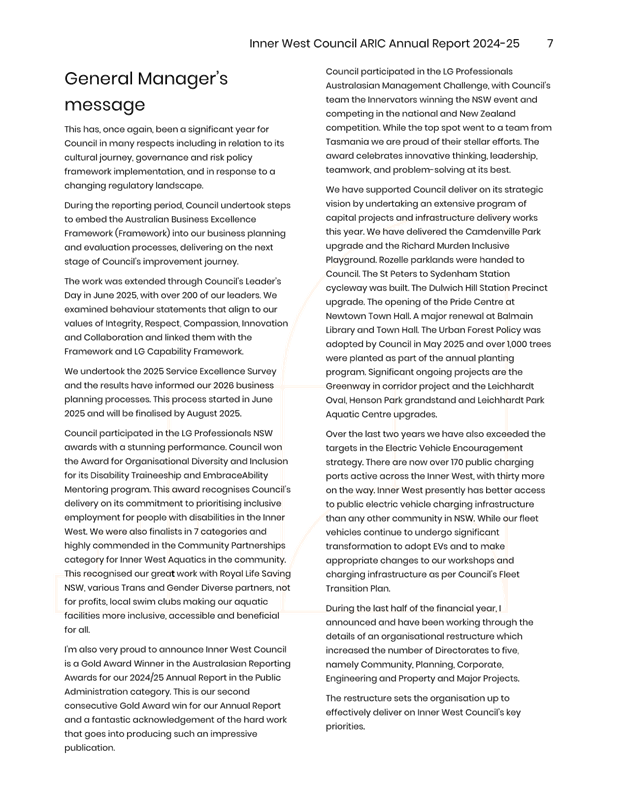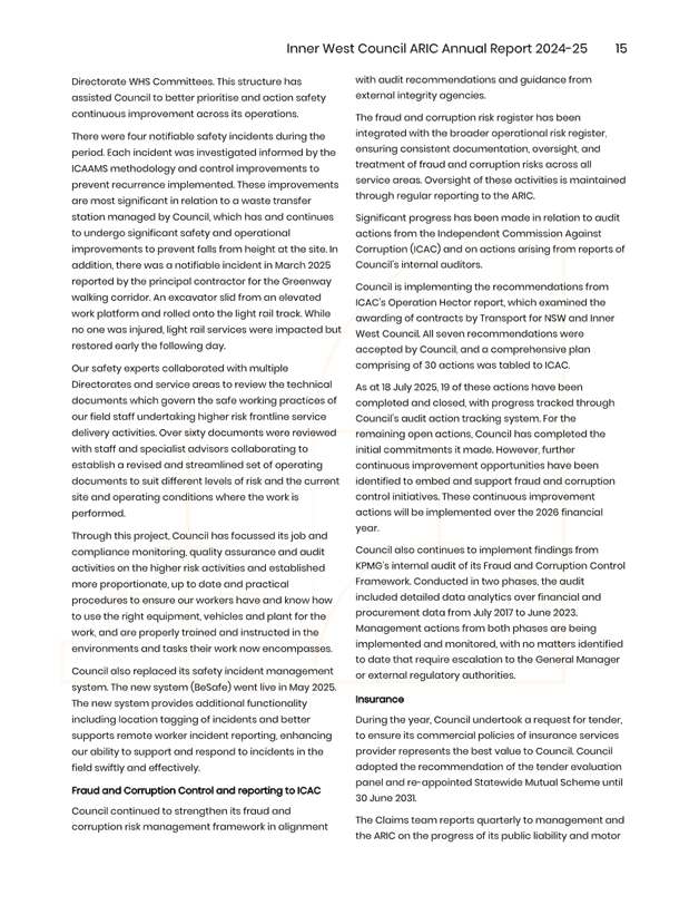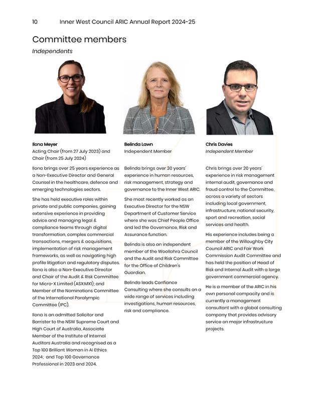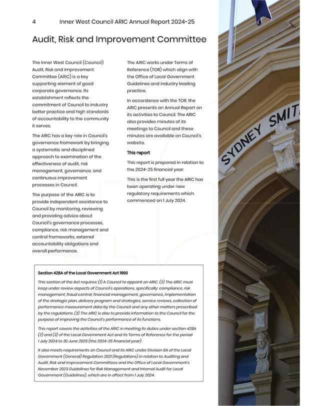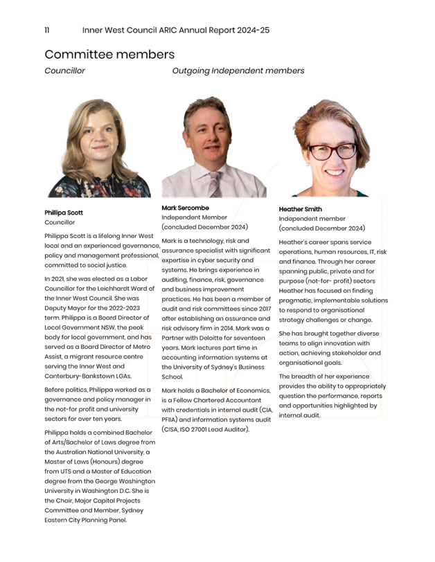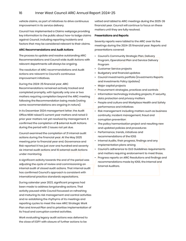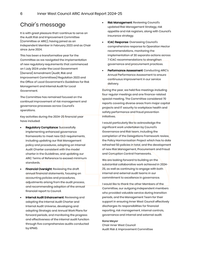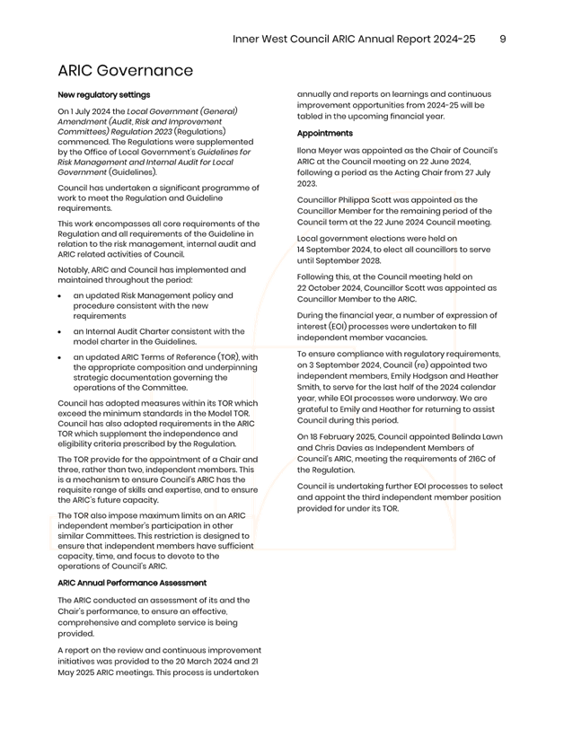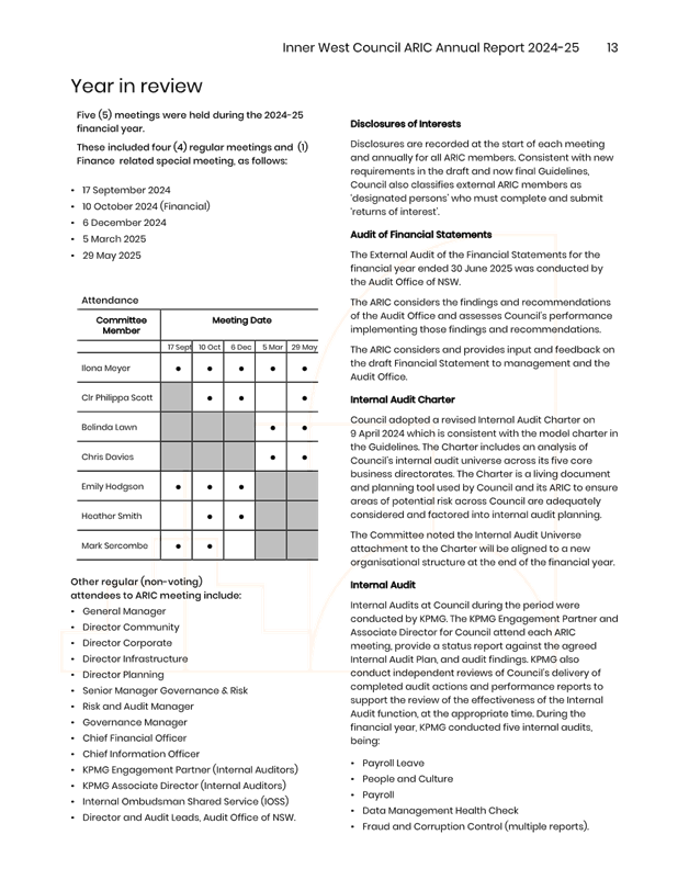 The minutes reflect ARIC’s approval of the draft ARIC Annual Report 2024-25. The ARIC annual reports are aligned to a financial year reporting timetable, consistent with Office of Local Government Guidelines on Risk Management and Internal Audit and with Council’s broader annual and financial reporting requirements.