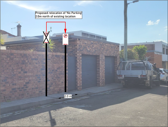 Option 2 (Figure 3) proposes that the ‘No Parking’ restriction be extended by a further 9m to the power pole at the rear of No.43 Warren Road, Marrickville. This would provide unimpeded access in both directions for the rear access garage of No.12 Church Street, Marrickville.