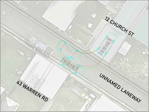 Option 1 (Figure 2) proposes that the existing ‘No Parking’ restriction on the southern side of the unnamed laneway (at the rear of Church Street and Warren Road) be extended 2m to the rear gate of No.43 Warren Road, Marrickville. This is expected to minimise overhanging vehicles into the existing ‘No Parking’ restriction which impacts the vehicle turning path from the rear access garage of No.12 Church Street, Marrickville.