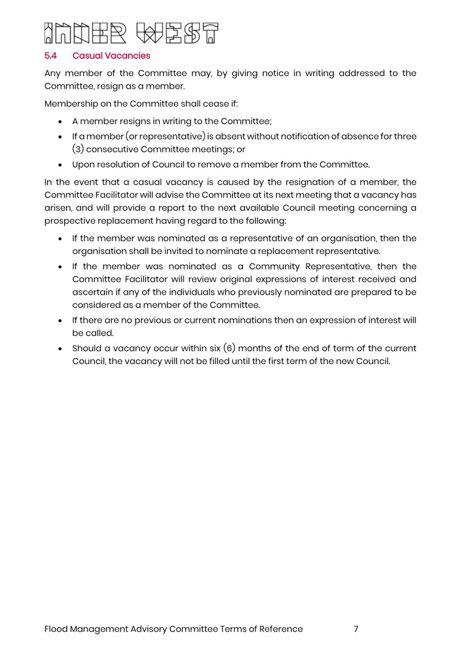 Clause 7.4 Public Participation clause has been added to the Flood Management Advisory Terms of Reference following the August meeting. The structure of the clause and terms within it have been built from the local traffic forum clauses and code of meeting practise.