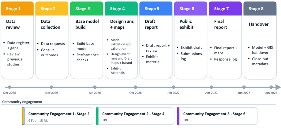Work to prepare the flood study commenced in December 2025 and it is being delivered over 18 months. The project is currently on track, with data review substantially progressed and the data collection phase now underway.